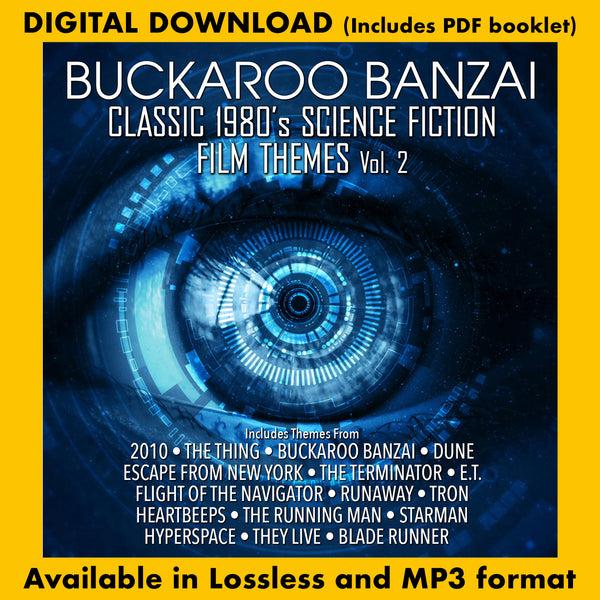 Buysoundtrax Digital presents a new compilation of newly recorded classic science fiction film themes. Included herein are themes from BUCKAROO BANZAI, DUNE, THE THING, BLADE RUNNER, THE TERMINATOR, E.T., STARMAN and many others.BUCKAROO BANZAI: Classic 1980's Science Fiction Film Themes - Vol. 2