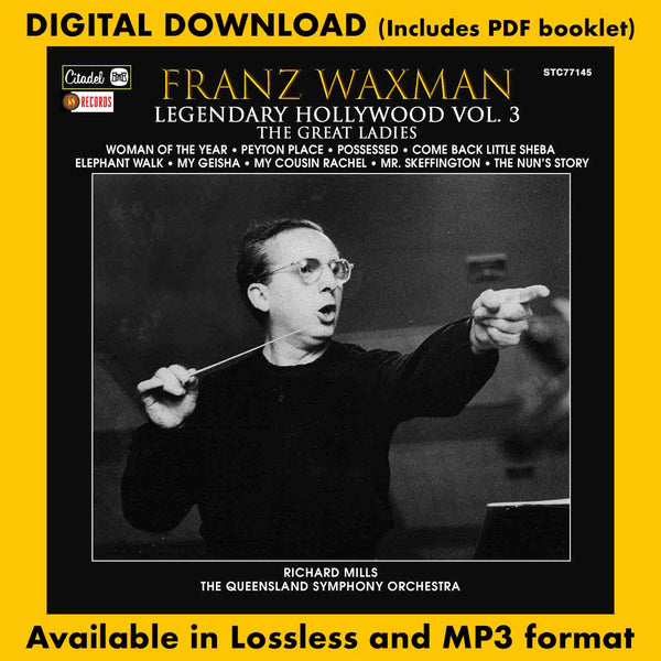 Citadel Records, a division of BSX Records, presents FRANZ WAXMAN: LEGENDARY HOLLYWOOD VOL. 3, THE GREAT LADIES featuring music from several films from the composer’s lengthy filmography, focusing on films centered on the popular leading ladies of the period. The music is performed by the Queensland Symphony Orchestra, conducted by Richard Mills.