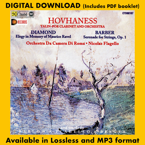 Buysoundtrax Digital, in association with Citadel Records presents works performed by the Orchestra Da Camera di Roma as conducted by Nicolas Flagello. Featured pieces include Talin for Clarinet and string orchestra, Serenade for Strings by Samuel Barber. Elegy in Memory of Maurice Ravel by David Diamond and others.