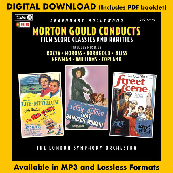 Buysoundtrax Digital, in association with Citadel Records, presents MORTON GOULD CONDUCTS FILM SCORE CLASSICS AND RARITIES featuring works by Aaron Copland, John Williams, Alfred Newman, Jorome Moross, Erich Wolfgang Korngold and others. Included herin are suites and themes from THE RED PONY, STAR WARS, AIRPORT, THE SEA HAWK, THE BIG COUNTRY, THAT HAMILTON WOMAN and more.
