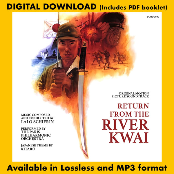 Originally released on compact disc in 2008 and very scarce, Dragon’s Domain Records brings RETURN FROM THE RIVER KWAI back to the marketplace, featuring music composed by Lalo Schifrin, including the Japanese Theme composed by Kitarô, performed by the Paris Philharmonic Orchestra. The music has been newly mastered by James Nelson at Digital Outland and the liner notes written for the previous release by Darren Allison have been reprised.
