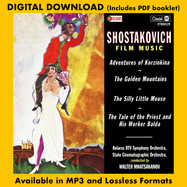 Buysoundtrax Digital in association with Citadel Records presents SHOSTAKOVICH FILM MUSIC featuring music composed by Dimitri Shostakovich for the films THE GOLDEN MOUNTAINS (1931), THE TALE OF THE PRIEST AND HIS WORKER BALDA (1934), ADVENTURES OF KORZINKINA (1940) and THE SILLY LITTLE MOUSE (1939). Performed by the Belarus RTV SYmphony Orchestra and the State Cinematographic Symphony Orchestra conducted by Walter Mnatsakanov.