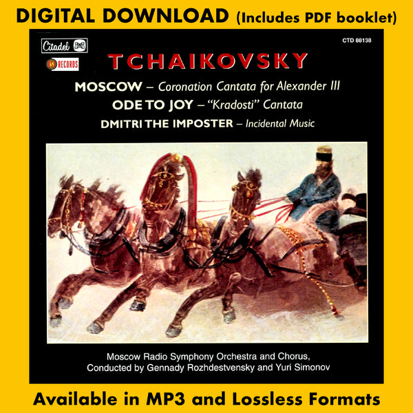 Buysoundtrax Digital in association with Citadel Records presents TCHAIKOVSKY: Moscow - Coronation Cantata for Alexander III / Ode to Joy - "Kradosti" Cantata / Dmitri the Imposter - Incidental Music. Performed by the Moscow Radio Symphony Orchestra and Chorus conducted by Yevgeny Akulov, Gennady Rozhdestvensky and Yuri Simonov.