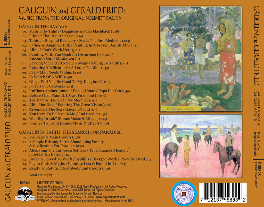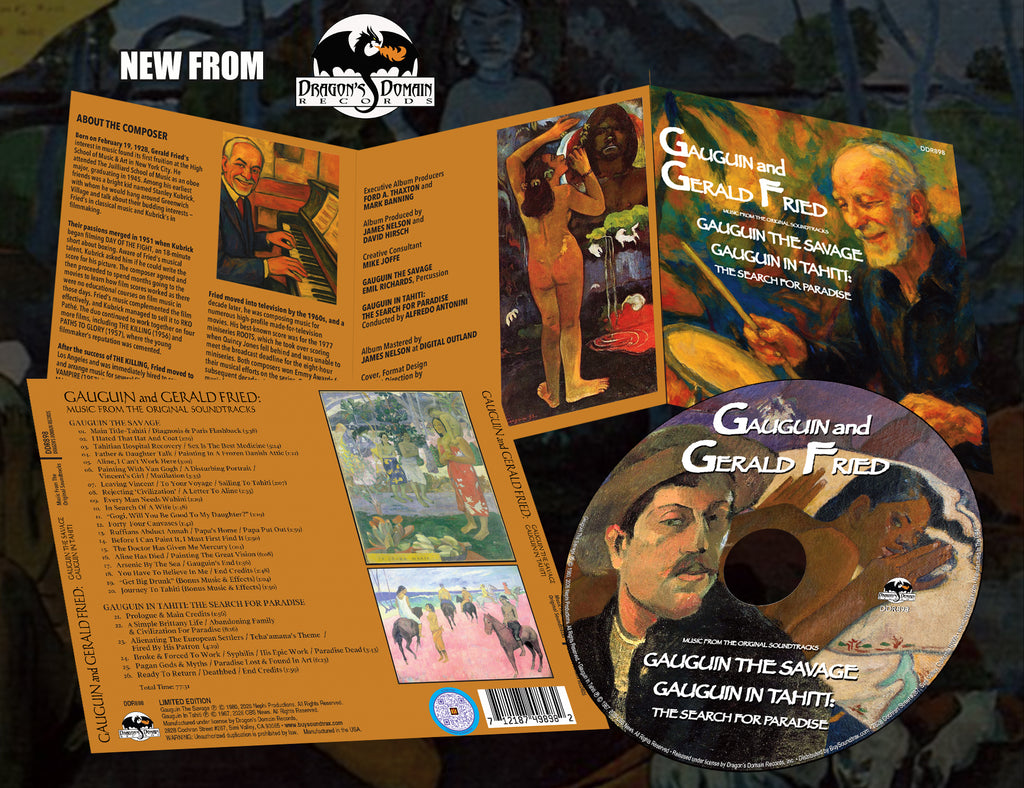 Dragon’s Domain Records presents GAUGUIN AND GERALD FRIED, featuring the world premiere release of GAUGUIN THE SAVAGE and GAUGUIN IN TAHITI: THE SEARCH FOR PARADISE, featuring music composed by Gerald Fried. The music has been mastered by James Nelson at Digital Outland and the liner notes have been written by author David Hirsch.