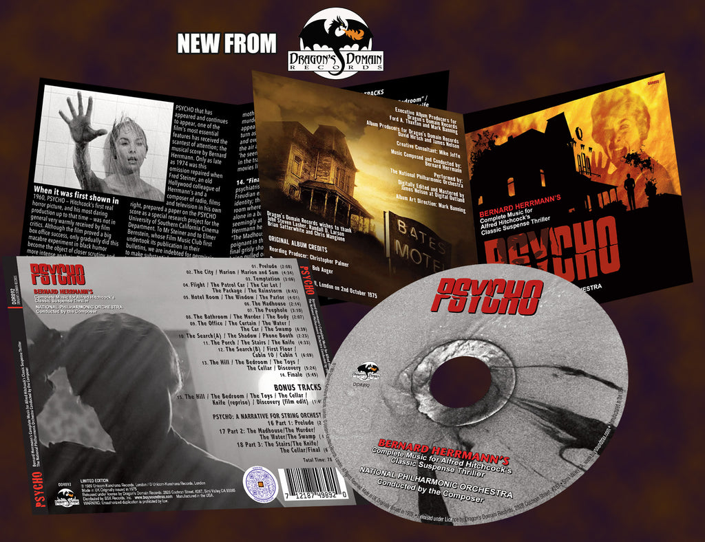Dragon’s Domain Records presents PSYCHO, featuring music composed by Bernard Herrmann (CITIZEN KANE, NORTH BY NORTHWEST, VERTIGO) for the 1960 horror classic directed by the legendary Alfred Hitchcock, written by Robert Bloch and Joseph Stefano, starring Anthony Perkins, Janet Leigh, Vera Miles, John Gavin, Martin Balsam, John McIntire and Simon Oakland.