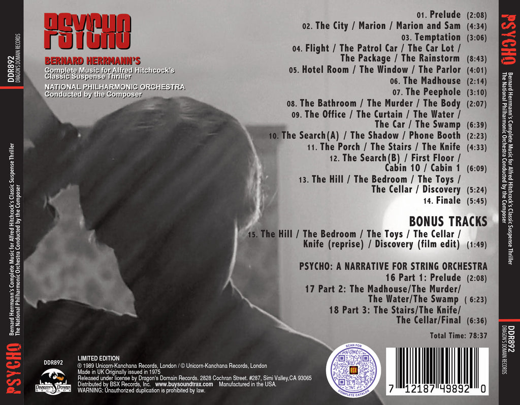 First released on vinyl in 1975 by Unicorn-Kanchana and later released in the early days of the compact disc format, this recording captured the first complete presentation of music from PSYCHO as performed by the National Philharmonic Orchestra and conducted by the composer himself in 1975. Dragon’s Domain Records is excited to bring PSYCHO back to the marketplace under license from Unicorn-Kanchana, newly remastered by James Nelson at Digital Outland and retaining the original album liner notes by Christopher Palmer.
