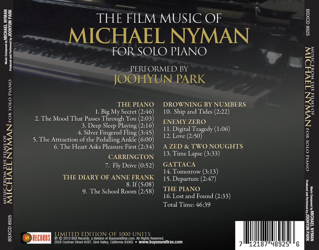 BuySoundtrax Records is proud to present THE FILM MUSIC OF MICHAEL NYMAN FOR SOLO PIANO featuring piano performances by Joohyun Park. The recording will be available digitally, in stores, and from www.buysoundtrax.com on April 10th. “I started this piano album by concentrating solely on music from THE PIANO,” said Park. “All music of Michael Nyman has stunning, beautiful and dynamic melodies and it really began to capture my attention. I wanted to record more of Nyman’s work after working on the pieces from THE PIANO.”